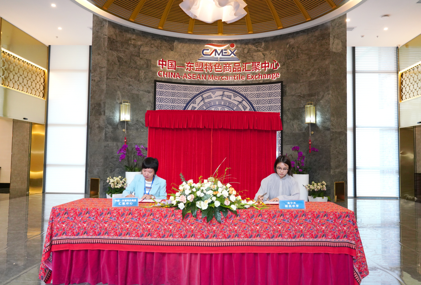 2023年10月10日,匯聚中心又吸引了南寧市第二中學(xué)、南寧市新民中學(xué)學(xué)生綜合實(shí)踐研學(xué)基地落戶(hù),并圓滿(mǎn)舉辦了簽約和揭牌儀式。南寧市第二中學(xué)校區(qū)副校長(zhǎng)曾晶、南寧市新民中學(xué)副校長(zhǎng)關(guān)雪、中國(guó)—東盟特色商品匯聚中心副總經(jīng)理盧春梅、中國(guó)—東盟特色商品匯聚中心副總經(jīng)理李丹共同出席儀式。