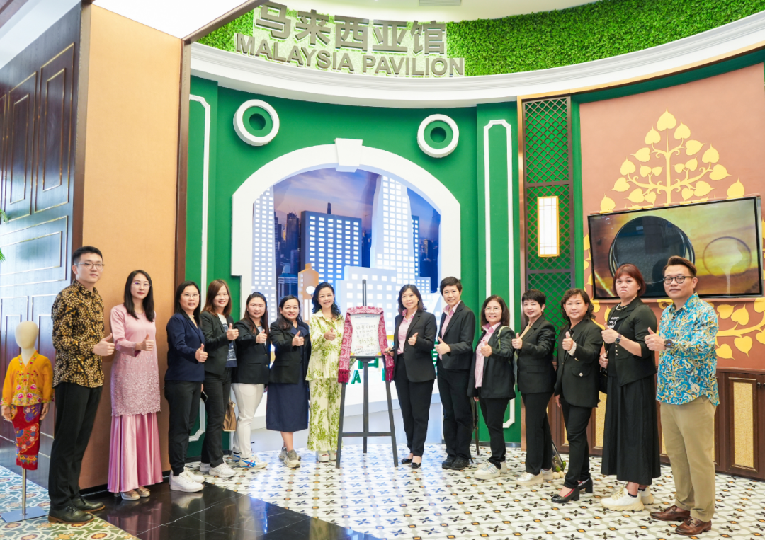 來(lái)到馬來(lái)西亞館,各類富有當(dāng)?shù)靥厣娜宋娘L(fēng)俗與“僑元素”生動(dòng)呈現(xiàn):從標(biāo)志性的雙子塔、五大經(jīng)濟(jì)走廊,到傳統(tǒng)巴迪布、高腳屋和榴蓮樹(shù)造景,無(wú)不喚起代表團(tuán)的熟悉與親切之感。館內(nèi)還陳列了燕窩、巧克力、白咖啡等特色商品,進(jìn)一步增強(qiáng)了實(shí)地體驗(yàn)的氛圍。大家紛紛就館內(nèi)已入駐商品的運(yùn)營(yíng)推廣情況,進(jìn)行詳細(xì)的了解和探討。在得知各館均有相應(yīng)館長(zhǎng)對(duì)商品進(jìn)行管理與推介時(shí),代表團(tuán)更是稱贊連連。