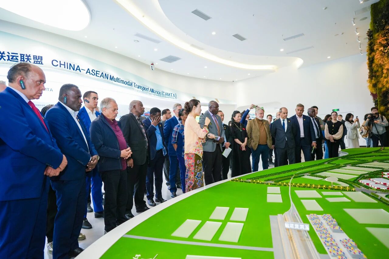 在中新物流園展示中心,駐華使節(jié)代表團通過圖文講解、動態(tài)演示等形式,了解項目的發(fā)展情況,進一步對西部陸海新通道的戰(zhàn)略地位與廣西作為通道關鍵節(jié)點的核心作用有了更深的認識。作為廣西參與“一帶一路”及推進中國與新加坡互聯(lián)互通、西部陸海新通道建設的項目之一,中新物流園自啟動建設以來,展現(xiàn)出蓬勃的發(fā)展活力。園區(qū)通過“以商招商”的模式,目前已引進超30家世界500強和中國物流100強龍頭品牌企業(yè)合作入駐,產(chǎn)業(yè)集聚效應持續(xù)增強,已形成有別于其他物流園區(qū)的產(chǎn)業(yè)發(fā)展模式。