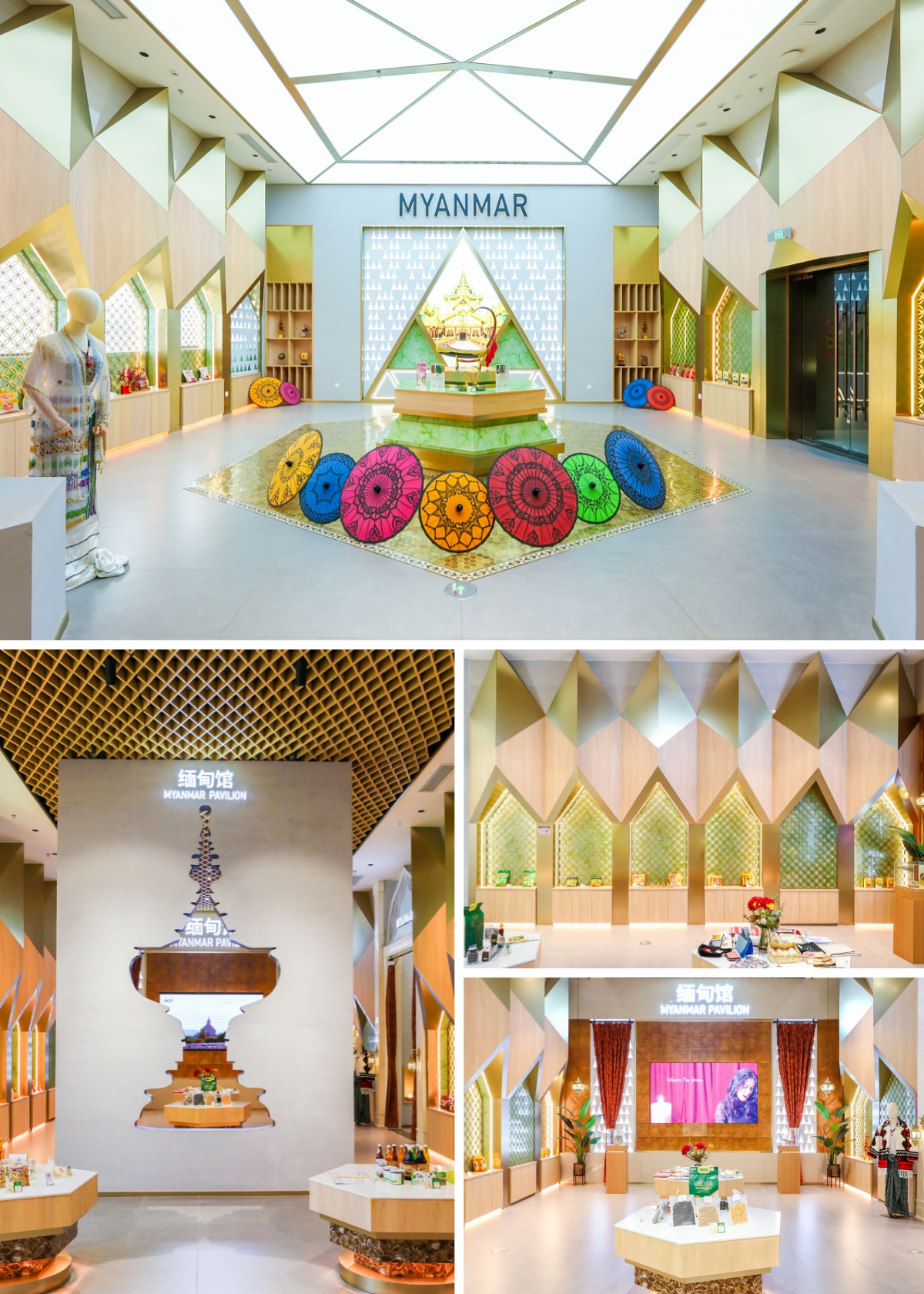匯聚中心精心打造了18個(gè)獨(dú)具特色的主題館。其中,緬甸主題館以緬甸深厚的歷史文化為根基,提取經(jīng)典佛塔輪廓、翡翠色澤、寶石切面與漆器造型等代表性元素,巧妙融入當(dāng)?shù)鬲?dú)特風(fēng)土人情,并借助現(xiàn)代設(shè)計(jì)語(yǔ)言進(jìn)行演繹,為到訪者呈現(xiàn)出一個(gè)流光溢彩、熠熠生輝的“金色緬甸”。